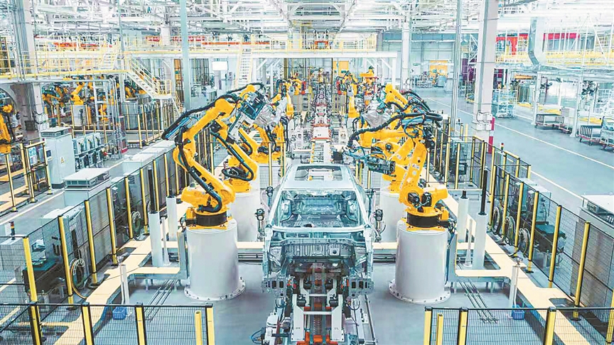 作为安徽省芜湖市汽车制造业的“首席企业”“链主企业”,今年上半年,奇瑞销量“成绩单”实现营收2805亿元,同比增长38.3%。图为在奇瑞汽车智造一工厂冲压车间内,灵活的机械臂正在组装新车。