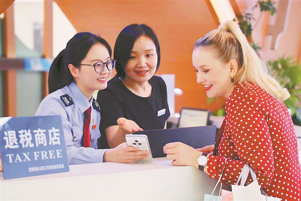 国家税务总局江苏省税务局数据显示,截至目前,江苏省已有离境退税商店407家,覆盖全省各地市。今年1月— 9月,由江苏口岸入境旅游者207.04万人次,同比增长22.9%,境外旅客在江苏离境退税商店开具离境退税申请单金额1.5亿元。 图为宜兴市税务局近日组织青年干部走进离境退税商店,向外籍人士推介离境退税“即买即退”便捷服务举措。