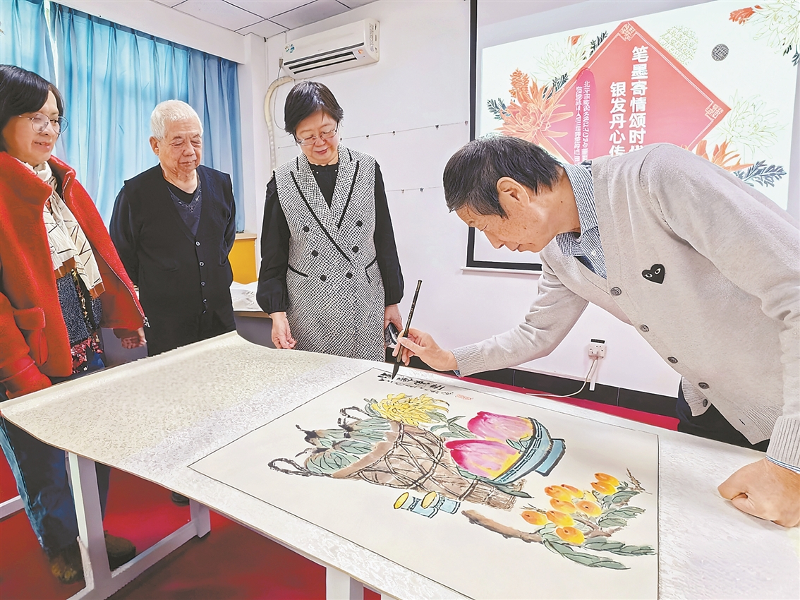 重阳节前夕,国家税务总局北京市税务局举办“笔墨寄情颂时代 银发丹心传税情”离退休人员书画摄影作品展。活动现场,一位老同志凝神提笔作画,以寓意吉祥的《福寿双至》图祝愿老同志的退休生活福寿康宁。