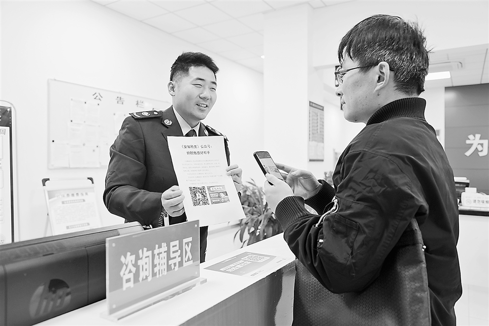 近日,在国家税务总局阜阳市颍东区税务局办税服务厅,纳税人向税务干部咨询涉税问题,并扫描税费业务操作指南二维码。