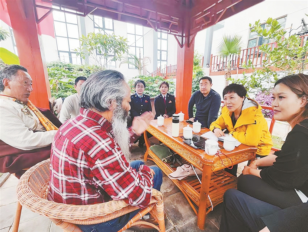 今年6月,在“文化中国行·长江揽胜”系列报道青海段,本报记者田福雁(右二)、张天墨(右三)在青海省玉树藏族自治州采访长江源头文化学者文扎和《格萨尔》史诗说唱艺人才仁索南。