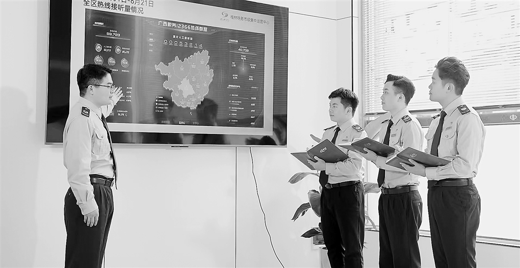 近期,广西税务部门全面实施“接诉即办、办问一体、全程互动”云端服务,强化大数据分析运用,研判纳税人缴费人个性化诉求和涉税风险。图为广西税务12366热线桂林税务税费服务运营中心干部分析热线接听情况。