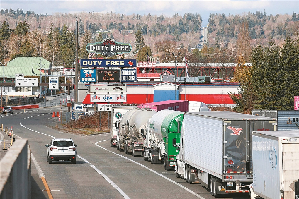 图为货车从加拿大经边境口岸驶向美国。