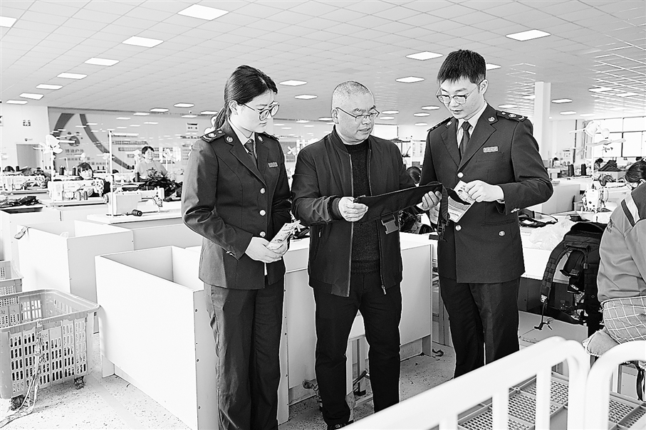 近期,国家税务总局明光市税务局组织“明税青锋”服务队,开展“送政策上门,促经营合规”活动。图为税务干部到户外用品制造企业,辅导企业合规归集研发费用,正确适用加计扣除政策。