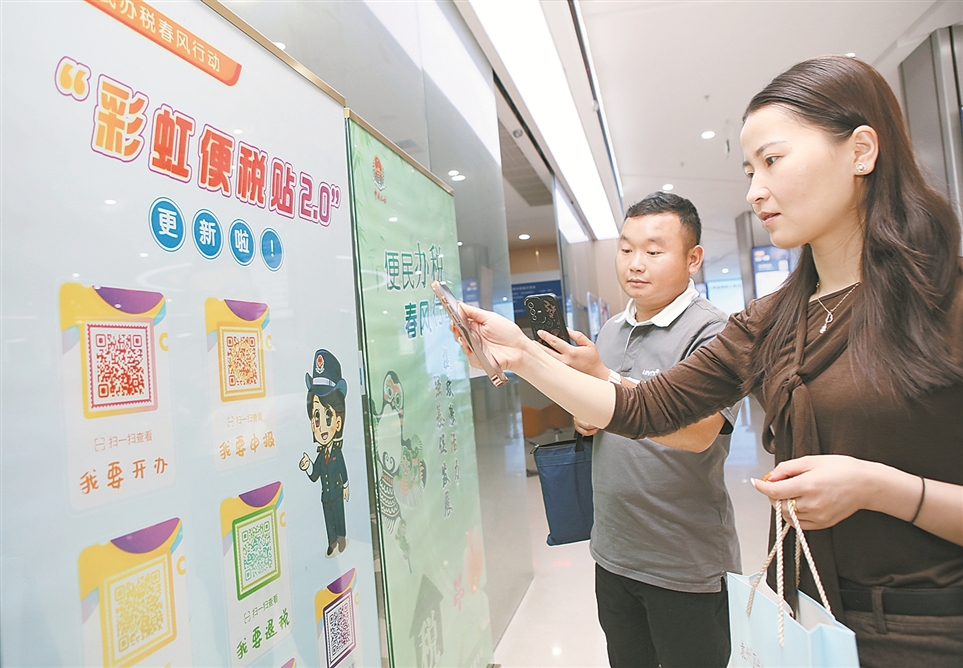 近期,国家税务总局宜春市袁州区税务局把税费政策及便民办税新举措制作成二维码,张贴在办税服务厅、大型商超等公共场所,方便纳税人缴费人随时查阅。图为纳税人在袁州区行政服务中心扫码了解个人所得税相关政策。