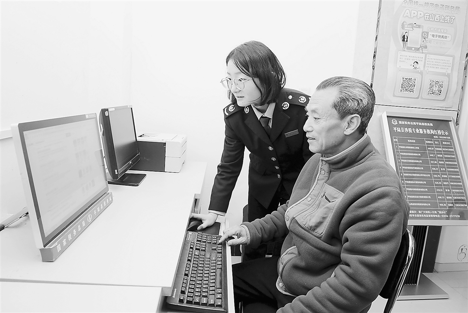 近日,国家税务总局平陆县税务局组织离退休干部开展“走流程、献良策”活动,通过实地参观、沉浸式体验等方式,请离退休干部为进一步优化税费服务建言献策。图为离退休干部在体验网上办税。