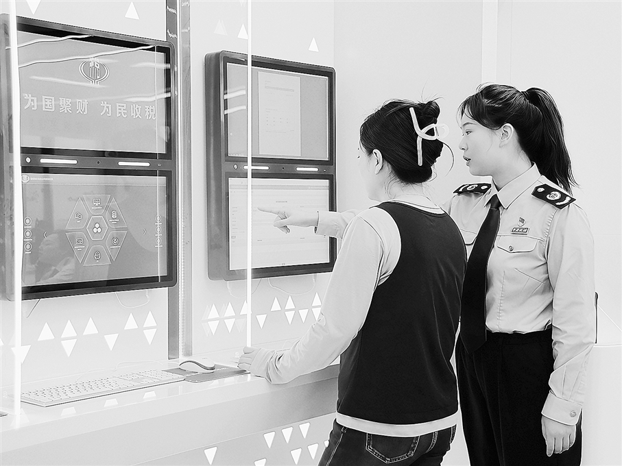 最近,国家税务总局长岭县税务局办税服务厅增配“双屏互动”智能自助办税终端,以“上屏智能辅助+下屏自主操作”的方式帮助纳税人办税。图为纳税人在税务干部辅导下,登录电子税务局办理涉税事项。