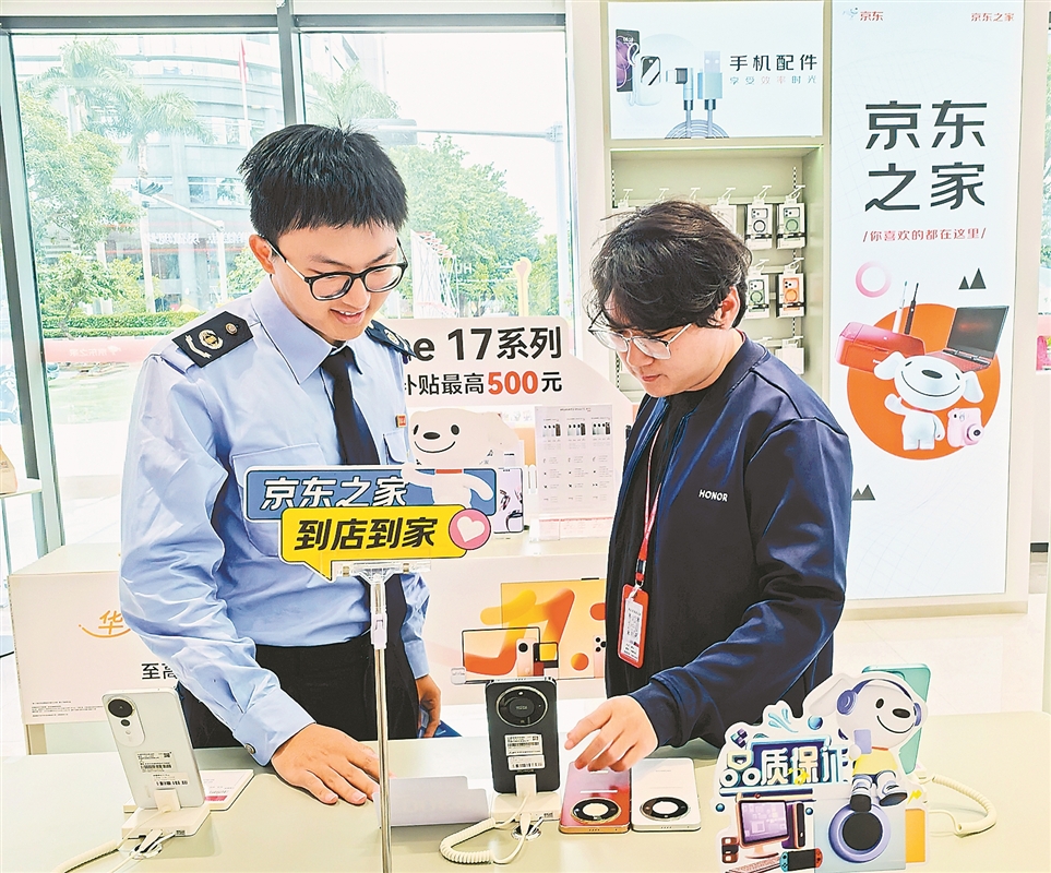 最近,国家税务总局佛山市禅城区税务局青年干部走访京东之家门店,宣传税费政策,引导企业合规经营、诚信纳税。图为税务干部向销售人员了解近期手机销售情况。
