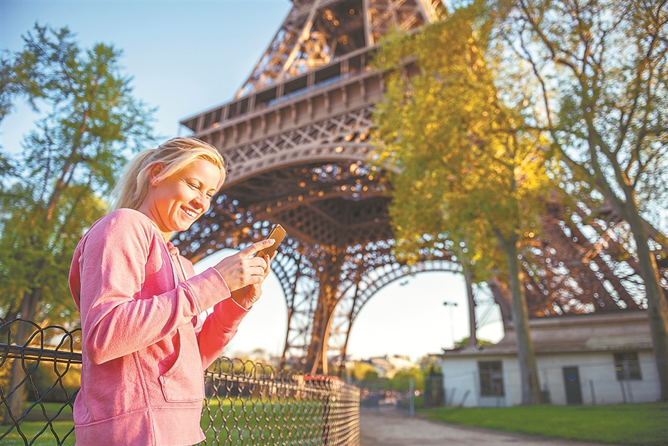 法国巴黎,一位女士通过智能手机使用社交媒体。