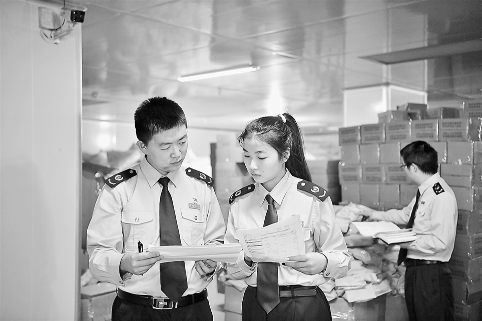 税务人员在企业仓储部门核查,查阅分析产品出入库信息。