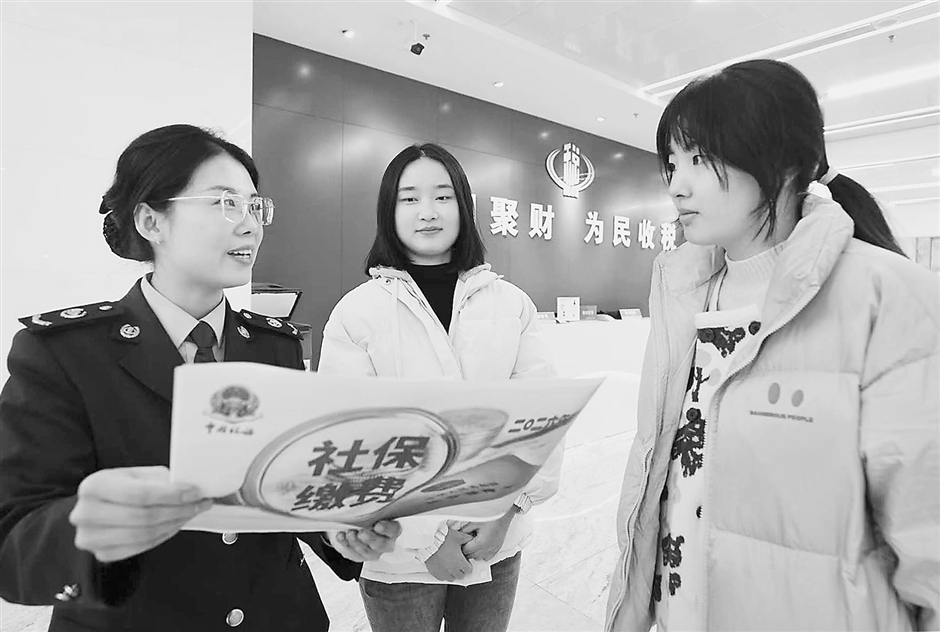 青岛市税务部门大力推行社会保险经办和缴费业务“一网通办”,实现企业社保缴费“网上办”、个人缴费“掌上办”,推动社保缴费更加便捷高效。图为国家税务总局青岛市市北区税务局干部近日向缴费人宣传城乡居民医保政策。