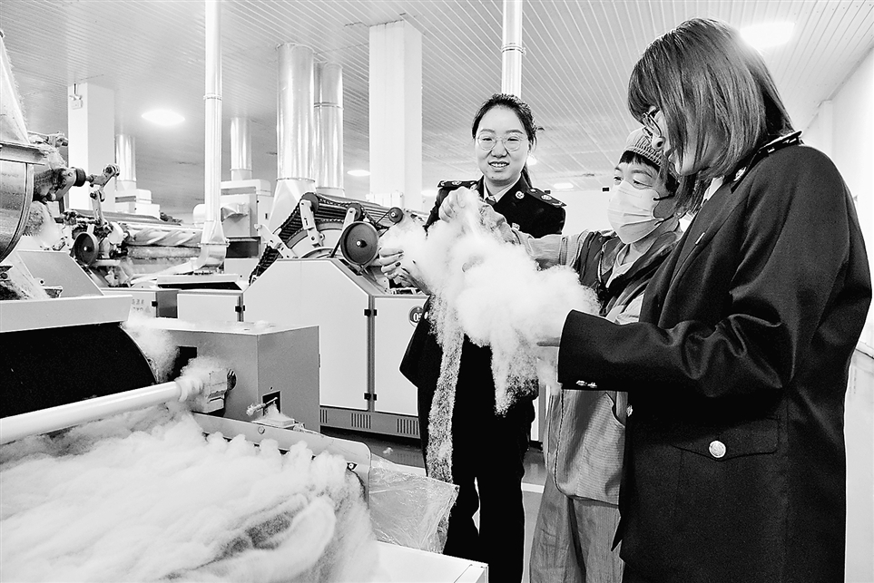 国家税务总局鄂托克旗税务局加强对农产品加工企业的税费政策辅导,帮助企业解决政策适用疑难问题。图为税务干部近日在一家羊毛加工企业调研,了解生产工艺和销售情况,宣传相关税费政策。