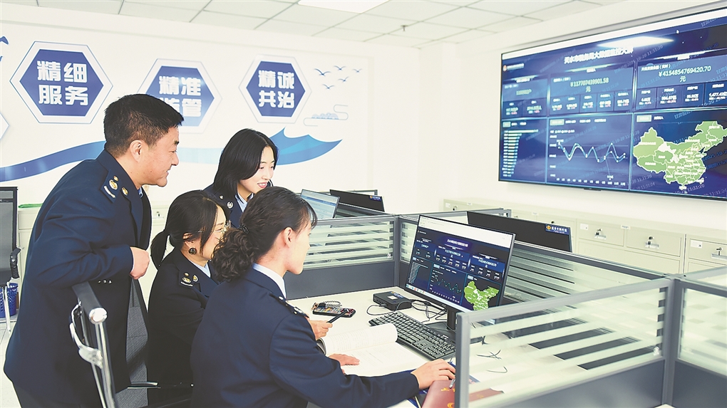 图为国家税务总局天水市税务局干部运用残保金风险指标模型,比对残保金申报信息与企业所得税数据。