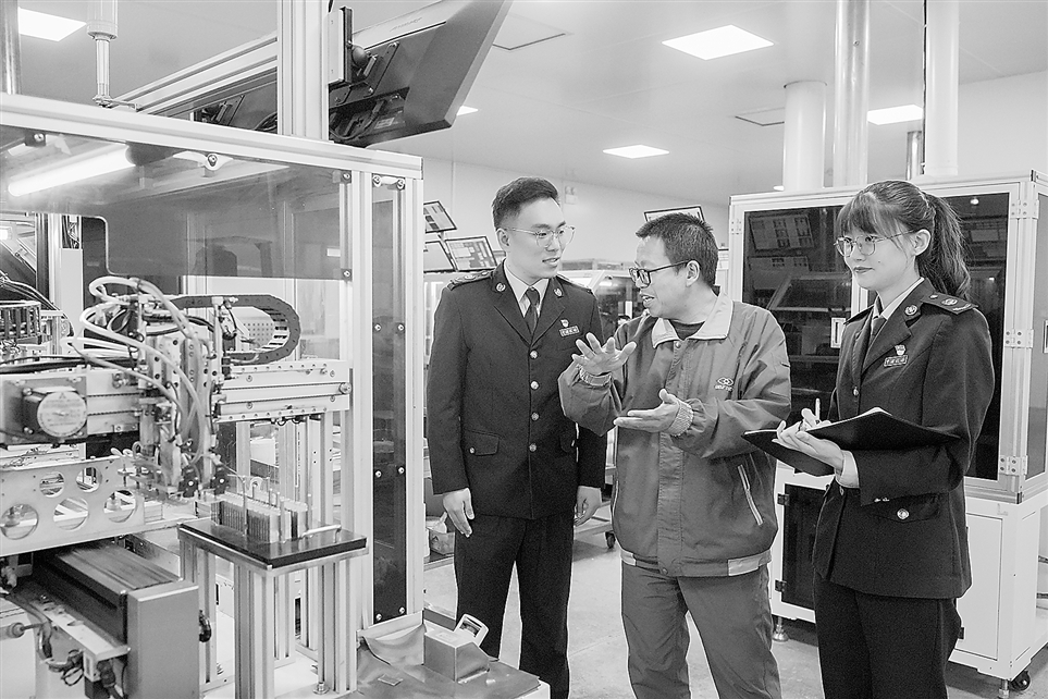 近期,国家税务总局济南市历城区税务局干部走进辖区出口企业,围绕单证备案及收汇管理等方面开展合规辅导,帮助企业进一步规范出口业务管理。图为税务干部日前在一家电子产品出口企业了解生产销售情况,提示提醒出口业务涉税管理规定。