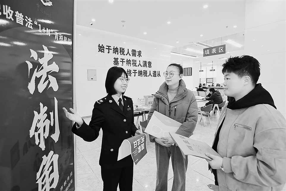 国家税务总局青岛市税务局加强税收普法宣传,在全市建立校园“法制角”等“税收法治+”场所200余个。图为青岛市市北区税务局办税服务厅干部近日在“法制角”为纳税人讲解税收法律法规知识。