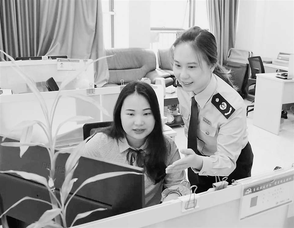图为叶依颖(右)辅导企业人员开展企业所得税年度汇算工作。