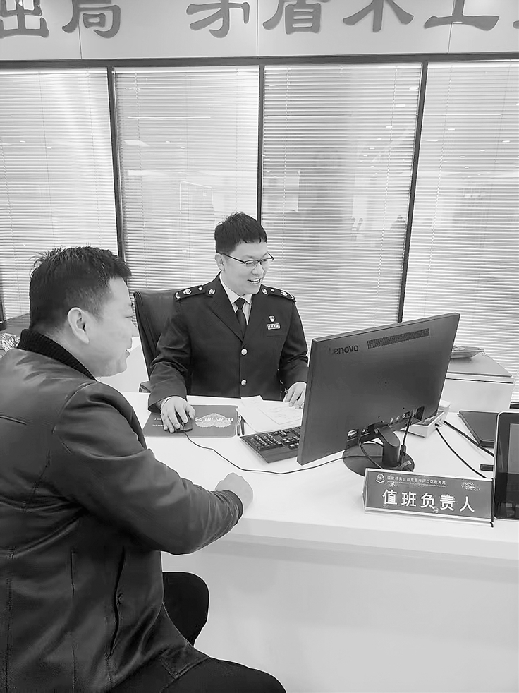 2025年3月,吴振飞(右)在河口区税务局办税服务厅解答纳税人问题。