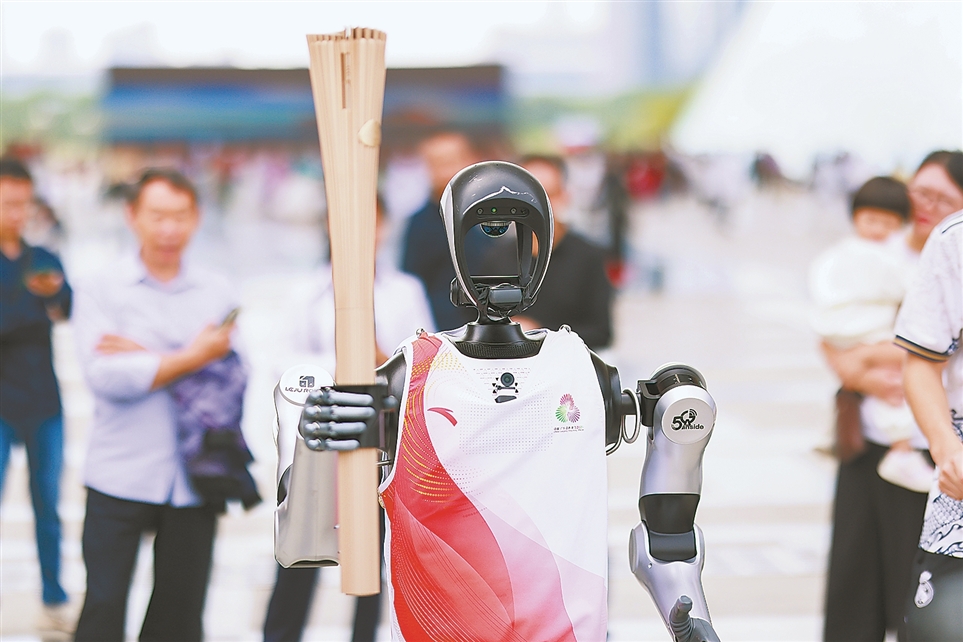 税收助力高水平科技自立自强 第十五届全国运动会火炬传递启动仪式现场,乐聚智能(深圳)股份有限公司自主研发的机器人“夸父”手握火炬,完成第二棒与第三棒之间的传递。
