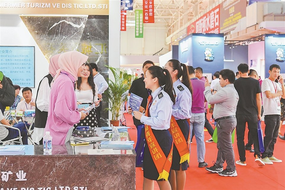 税收普法出新出彩 今年10月,第十六届云浮石文化周举办期间,国家税务总局云浮市税务局在现场设立流动服务点,青年干部给参展客商发放政策指引。