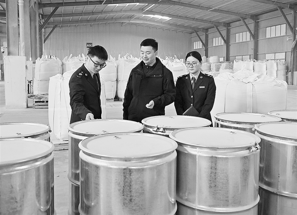 安徽省明光市是全国三大凹凸棒石黏土矿区之一,凹凸棒基新材料产业集群是该市特色产业。近期,国家税务总局明光市税务局组织税务干部走进凹凸棒新材料产业园,为相关企业辅导涉税政策,提示涉税风险。图为税务干部日前在园区了解企业生产情况。