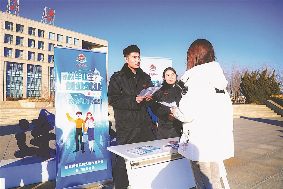 近日,国家税务总局大连市税务局第三税务分局干部走进大连海洋大学开展税法宣传,向大学生讲解创业就业相关税收政策。