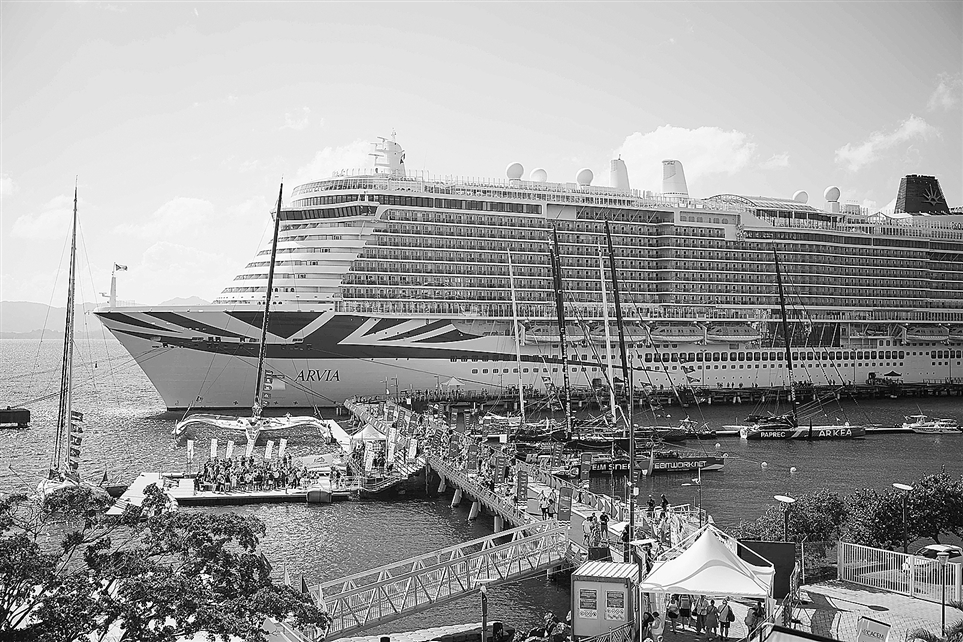 图为一艘邮轮停泊在法国马提尼克岛法兰西堡的港口。