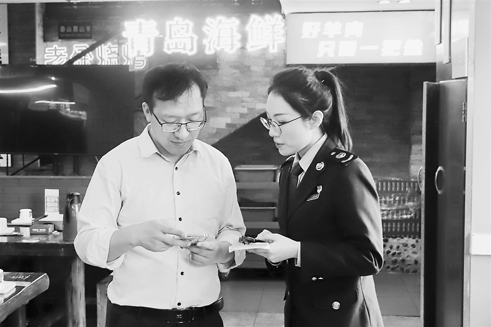 近日,国家税务总局青岛市市南区税务局干部走进中山路商业区,向商户宣传相关税费政策。图为税务干部引导商户用手机App办理缴税、开票、完税证明查询等业务。