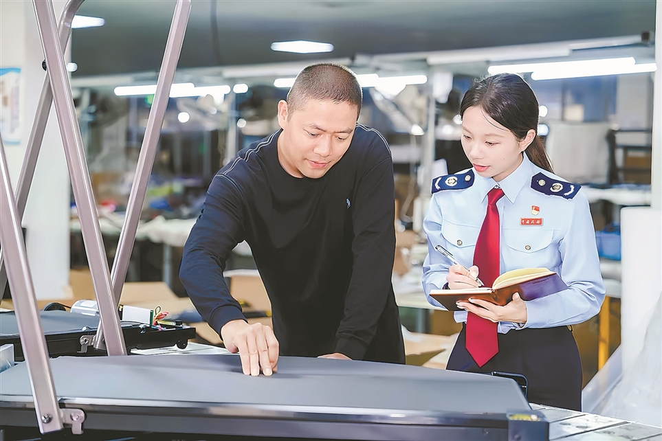 日前,国家税务总局慈溪市税务局干部走访制造业企业,重点宣传设备更新、技术研发等方面税费政策。图为税务干部在宁波众跑健康科技有限公司了解智能调速跑步机的生产工艺。