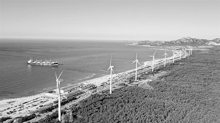 山东省荣成市,银白色的风车群沿着滨海大道整齐排列。 黄丽雅 摄