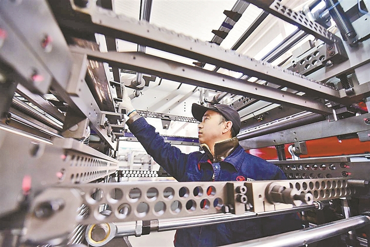 河北省玉田县是“中国印刷包装机械之乡”,聚集着380余家链条企业,产品国内市场占有率达到20%以上。图为唐山嘉谊印刷机械有限公司“深压纹+烫金机”研发测试车间。