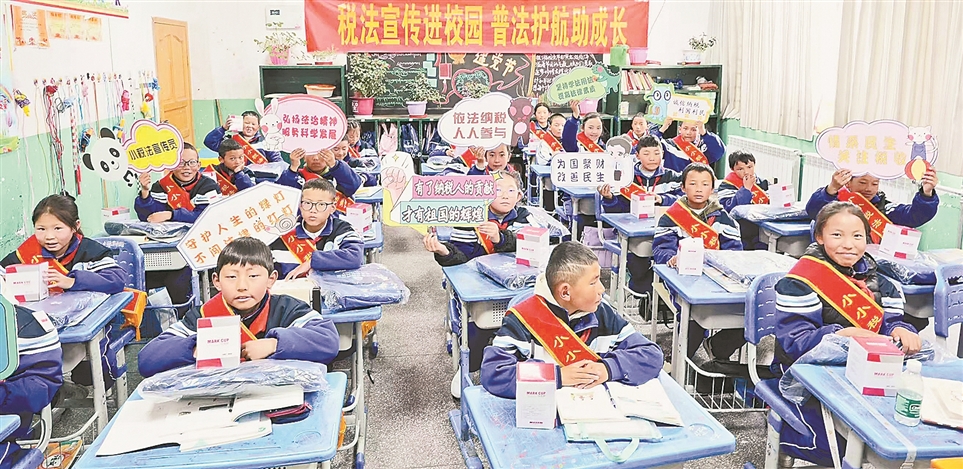 图为国家税务总局措美县税务局干部走进措美镇小学,开展“税法宣传进校园 普法护航助成长”活动。