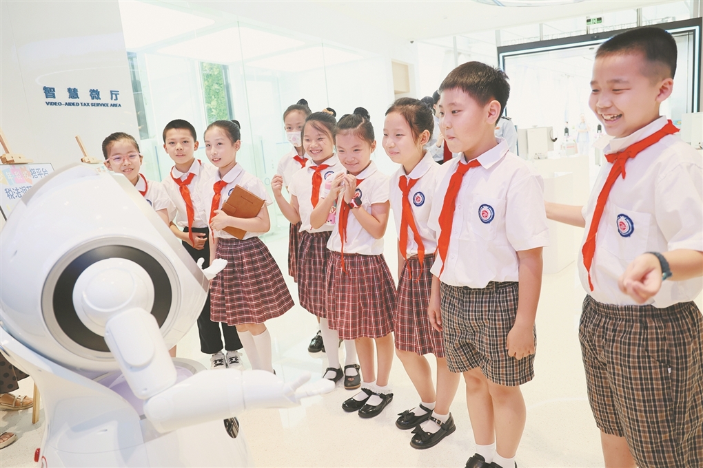 在深圳市宝安区税务局的办税服务厅内,来自宝安区天骄小学的学生正在和智慧办税机器人互动。