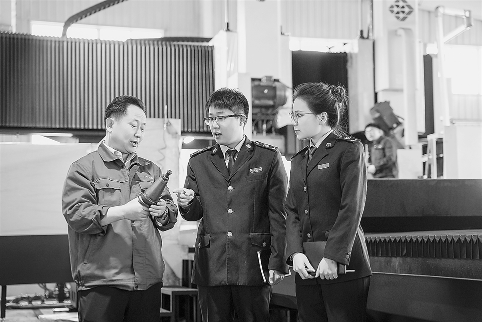 国家税务总局威海临港经济技术开发区税务局近期走进辖区内科技企业,帮助企业排查研发费用归集不准确、佐证材料不完备等税务风险。图为税务干部日前在一家机床企业了解研发项目推进情况。