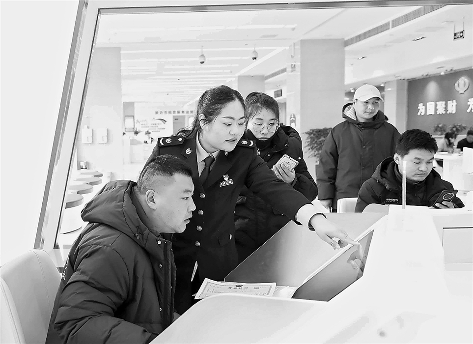 陈晓彤(左二)在办税服务厅辅导纳税人完成红冲增值税发票业务。