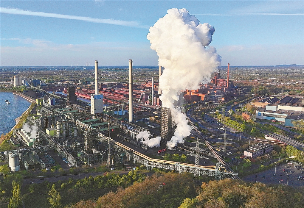 图为德国杜伊斯堡蒂森克虏伯钢铁厂,高炉排放出蒸汽。