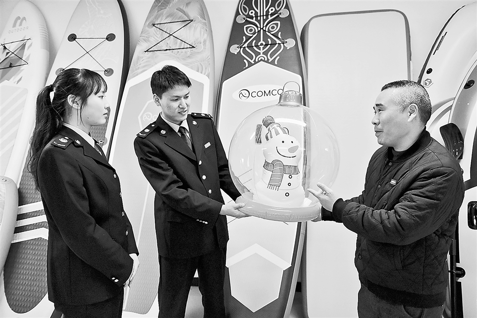 日前,国家税务总局盱眙县税务局组织干部到外贸企业开展调研,了解企业在出口退税业务办理方面的服务需求。图为税务干部在一家外贸企业了解产品生产和出口情况,提醒企业合规适用出口退税政策。