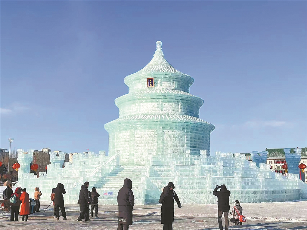 位于吉林省长春市朝阳区文化广场的“盛世中华”主题大型冰雕景观,以天坛建筑为核心,配以祈年殿标识,融合长城元素与红灯,成为众多游客来长春游玩的拍照打卡之地。
