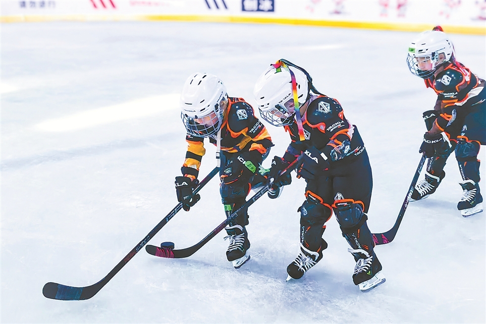 作为国家体育总局“百城千冰计划”示范基地,辽宁省阜新市奥体冰上运动中心承担着专业训练、赛事举办和普及推广的重要职能。图为在该中心面积1100平方米的室内标准真冰场上,孩子们正在进行冰球训练。