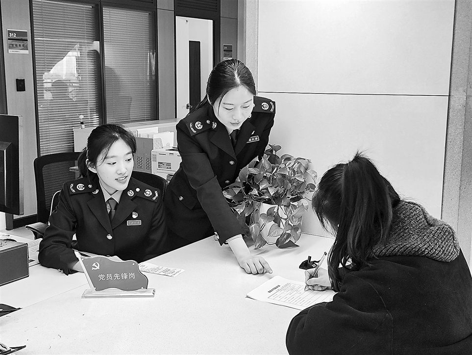 日前,国家税务总局北京市海淀区税务局在办税服务厅设立党员先锋岗,派出业务骨干为纳税人解答税费申报难点问题。图为税务干部日前为一名纳税人讲解报表填报流程。