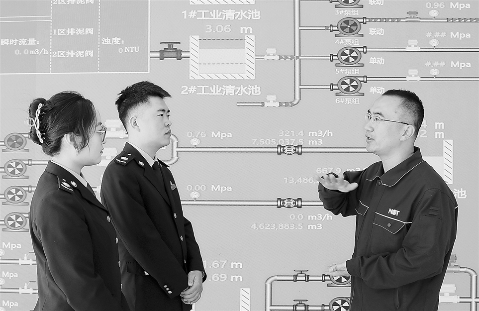 日前,国家税务总局吴忠市税务局太阳山开发区税务分局干部来到宁夏太阳山水务有限责任公司,开展走访调研和税费政策宣讲。图为税务干部在企业监控系统中控室了解企业生产情况。