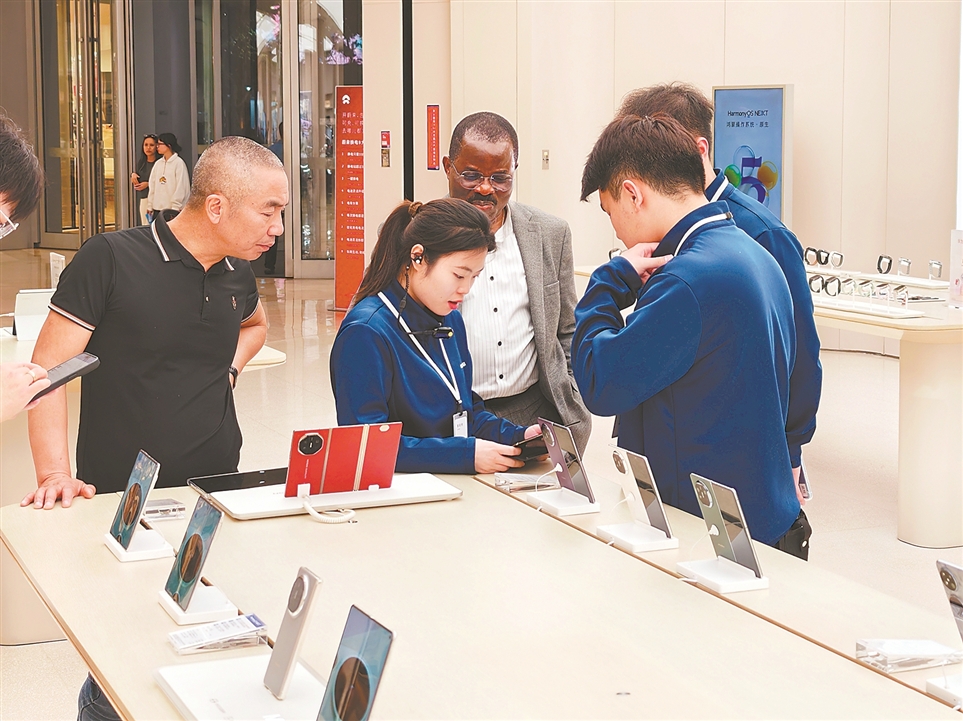在深圳,外籍人士入境消费十分火热。图为在提供离境退税服务的手机门店,店员正在向外国消费者介绍智能手机功能。