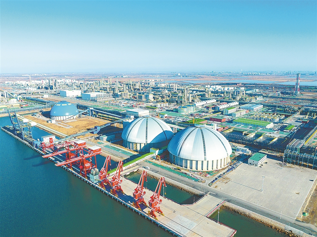 在华锦阿美精细化工及原料工程项目建设现场,罐体林立、塔管交错。