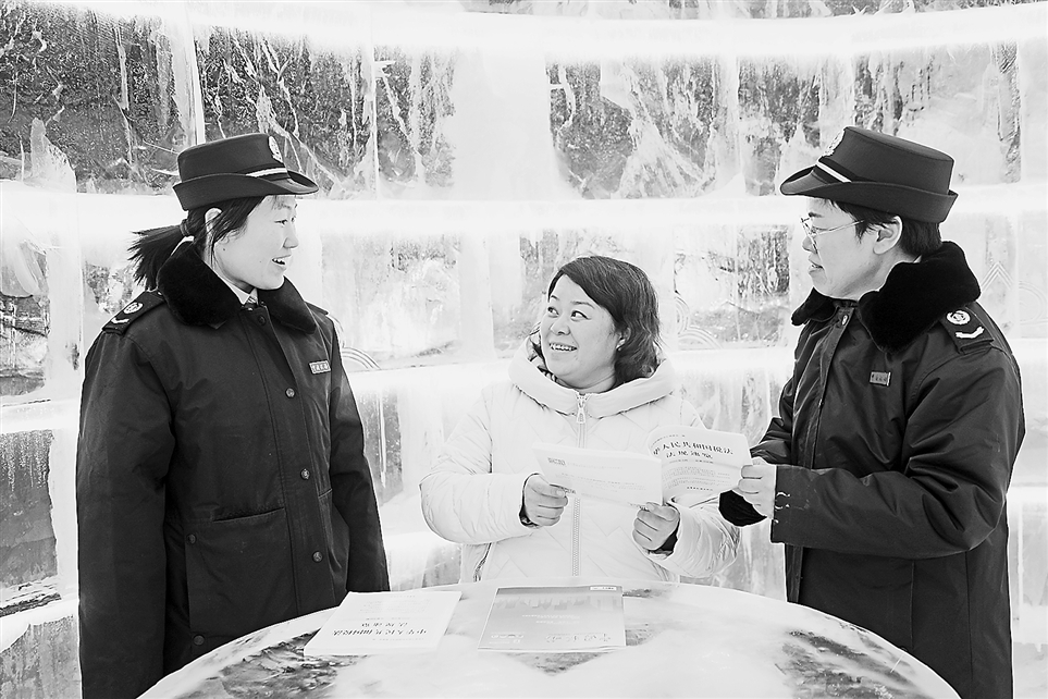 当前正值冰雪经济火热季节,国家税务总局内蒙古自治区税务局组织税务干部前往滑雪场、冰雪集市,向冰雪产业经营者开展税法宣传辅导,发放税费政策资料。图为税务干部近日在一家经营冰雕业务的企业,了解经营情况,宣传相关税费政策。