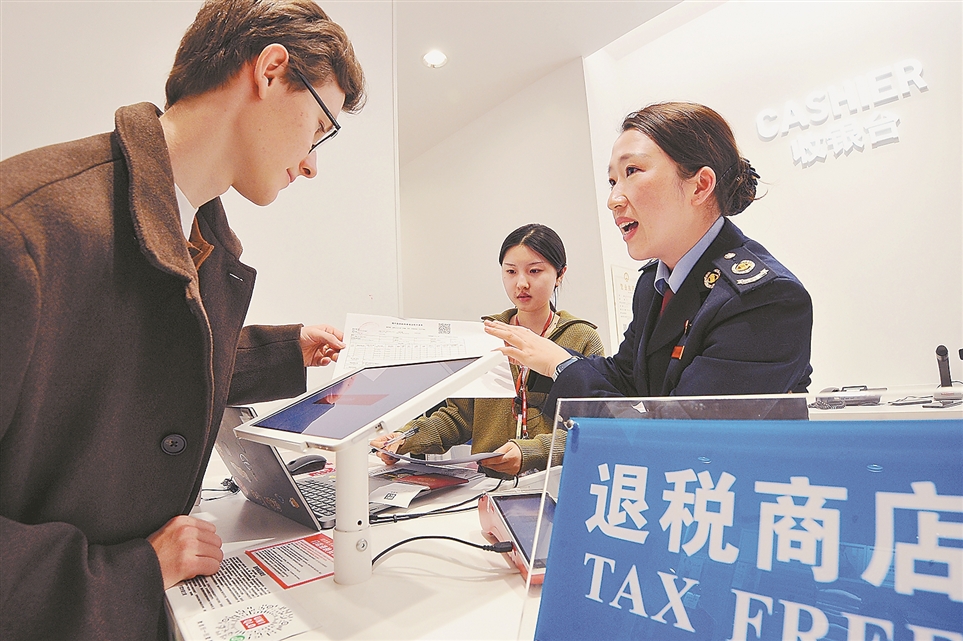 2025年,税务部门不断优化离境退税服务,持续提高离境退税服务便利化水平,更好助力释放入境旅游消费潜力。左图为北京市东城区税务局干部日前在位于王府井商圈的离境退税“即买即退”集中退付点,协助入境旅客办理离境退税。右图为深圳市龙岗区税务局干部近日在当地购物中心的离境退税门店,为销售人员讲解“即买即退”政策。 苏御 王善宏 融亦 麻晓璇 摄