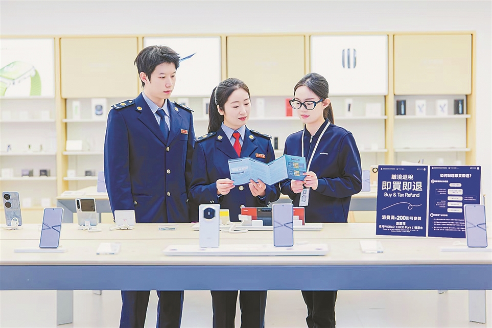 2025年,税务部门不断优化离境退税服务,持续提高离境退税服务便利化水平,更好助力释放入境旅游消费潜力。左图为北京市东城区税务局干部日前在位于王府井商圈的离境退税“即买即退”集中退付点,协助入境旅客办理离境退税。右图为深圳市龙岗区税务局干部近日在当地购物中心的离境退税门店,为销售人员讲解“即买即退”政策。 苏御 王善宏 融亦 麻晓璇 摄