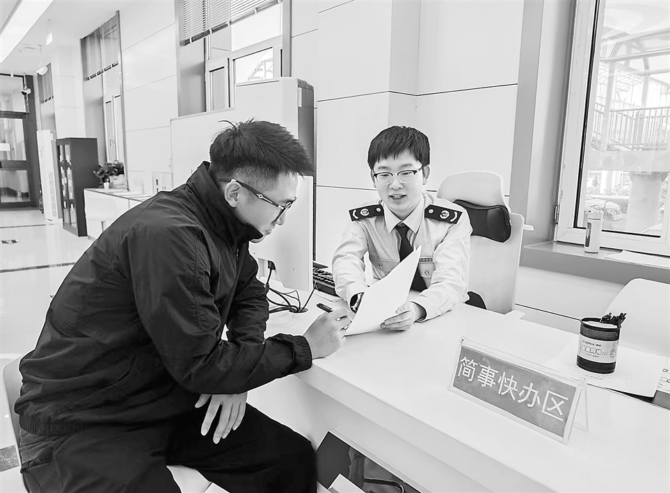 国家税务总局扶余市税务局在办税服务厅设立“简事快办区”,通过一窗受理、一次告知、一站办结方式,集中办理高频简易涉税事项,持续提升办税缴费便利度。图为税务干部近日为一名纳税人介绍发票领用流程。