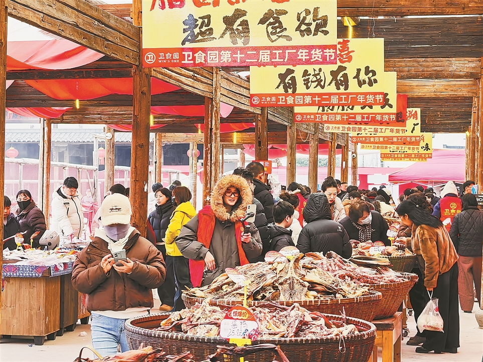 农历马年春节临近,安徽省蚌埠市卫食园食品有限公司打造的卫食园民俗博物馆凭借徽派水乡建筑风格走红网络。商家借势开展第十二届工厂年货节活动,市民与游客纷纷涌入年货大集,穿梭采购,现场人头攒动、烟火气十足。
