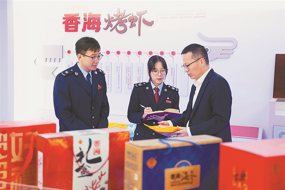 近期,国家税务总局瑞安市税务局组织干部走进海产品制造销售企业,开展税费政策辅导。图为税务干部在浙江香海食品股份有限公司销售门厅了解产品销售情况。