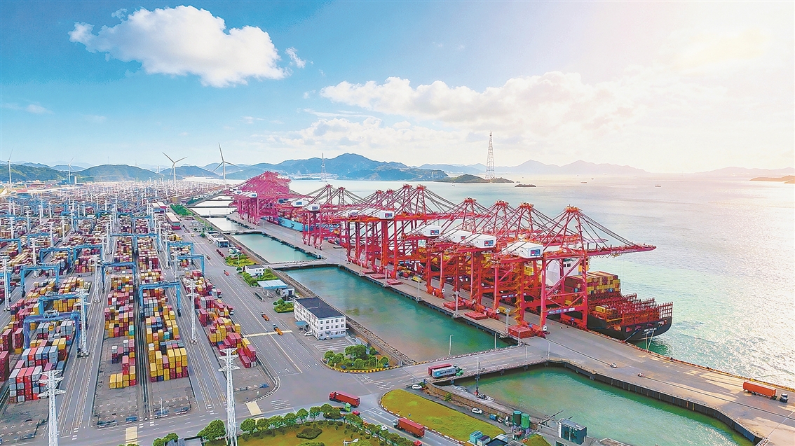 作为“21世纪海上丝绸之路”的重要枢纽,宁波舟山港持续织密全球航线网络,目前已连接全球200多个国家和地区的700多个港口。图为宁波舟山港穿山港区集装箱码头。
