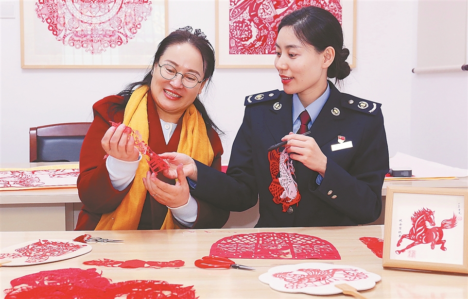 近日,国家税务总局延安市税务局青年干部来到延安剪纸协会宣讲文化产业税收政策。图为延安剪纸传承人杜小艳(左)在和青年干部交流。